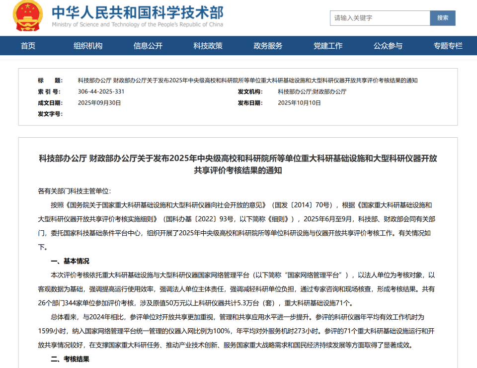 2025年10月10日,科技部办公厅、财政部办公厅联合发布《2025年中央级高校和科研院所等单位重大科研基础设施和大型科研仪器开放共享评价考核结果的通知》。在本次考核中,医学实验中心在全国26个部门344家参评单位中位列第26名,考核结果获评“优秀”,创下中医药行业在该考核中的历史最